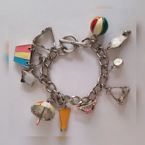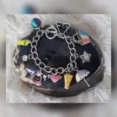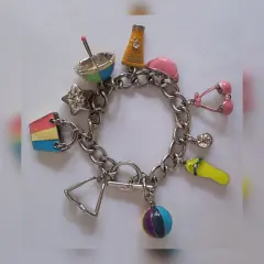 Pulsera eslabones forzados tono PLATEADO modelo "Playa", c/múltiples dijes esmaltado MULTICOLOR y cierre p/gancho barra. Dimensiones cms: 16 largo. Aleación de zinc.***EL ESMALTADO DE LOS DIJES ES MUY BELLO Y NO LO CAPTAN LAS FOTOGRAFÍAS***