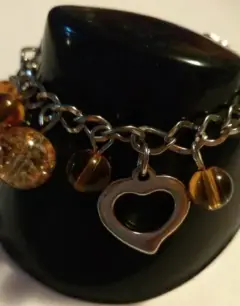 Pulsera diseño de corazones. Pulsera de cadena de acero inoxidable cuentas de cristal color ámbar marrón