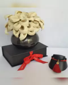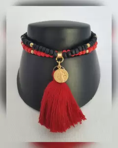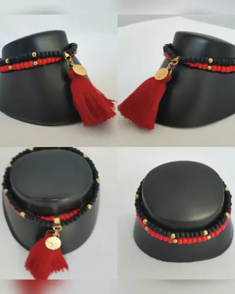 Pulsera autoajustable doble hilo bitono ROJO FUEGO/NEGRO ÉBANO, cuentas sintéticas, medalla tono dorado y copete en hilo. Dimensiones cms: 6.5***QUEDA A UNA MUÑECA DELGADA***