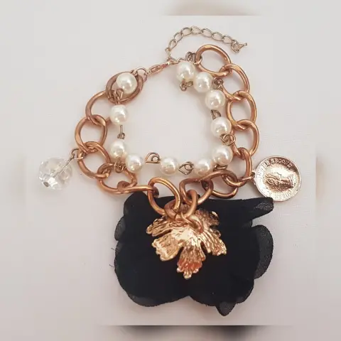 Pulsera Doble Hilo Moneda y Flor. Pulsera doble Hilo c/cadena rombo tono DORADO, perla sintética, dijes moneda, esfera facetada tono translúcido y flor en tela color NEGRO y cierre p/gancho lobster. Dimensiones cms: 15 largo, 5 extensor. Aleación zinc, acrílico y textil.