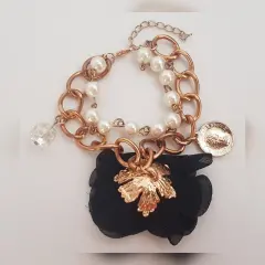 Pulsera doble Hilo c/cadena rombo tono DORADO, perla sintética, dijes moneda, esfera facetada tono translúcido y flor en tela color NEGRO y cierre p/gancho lobster. Dimensiones cms: 15 largo, 5 extensor. Aleación zinc, acrílico y textil.