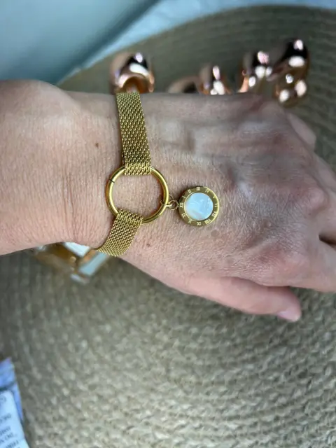 Pulsera dorada con madre perla. Pulsera con madre perla, números romanos. Envío sábados tal vez antes. No hago intercambios ni apartados. Acepto ofertas justas y de compra inmediata.