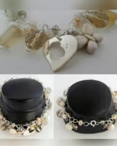 Pulsera eslabones circulares en alpaca tono plata con esferas y cilíndros bisutería tono champagne translúcido, dijes circulares y mariposa color beige marmoleado en imitación piedra y dije de corazón en plata. Dimensiones cms: 21 largo.