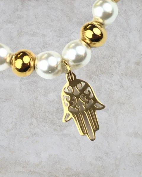 Pulsera de perlitas blancas y doradas con la mano de Fátima en acero inoxidable, tamaño chica pieza única.