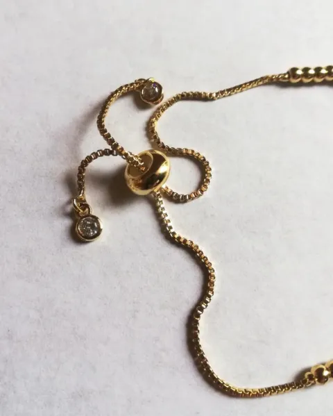 Pulsera de oro laminado ajustable, en la mano tiene pequeños cristalitos al igual que en las puntas.
