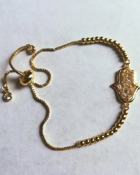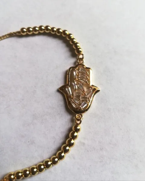 Pulsera mano de Fátima. Pulsera de oro laminado ajustable, en la mano tiene pequeños cristalitos al igual que en las puntas.