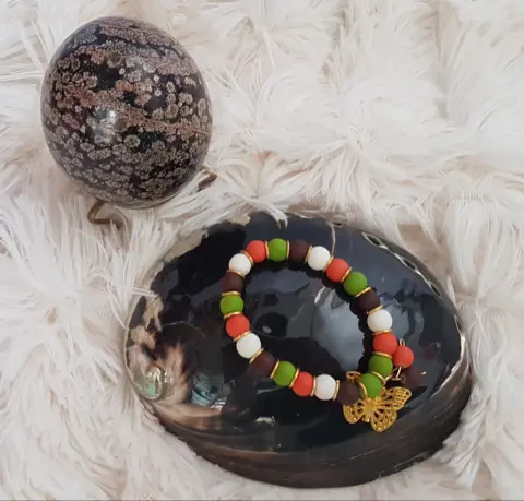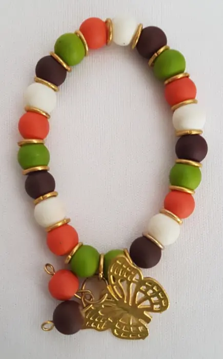 Pulsera autoajustable esferas acrílico MULTICOLOR en tonos BLANCO/TABACO/VERDE SECO/NARANJA, aros y dije mariposa en oro laminado. Dimensiones cms: 6 diámetro.***QUEDA A UNA MUÑECA DELGADA***