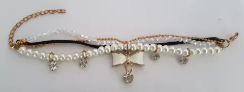 Pulsera triple hilo c/perlas sintéticas, cristal facetado BLANCO TRANSLÚCIDO, cadena bola DORADA, tira fake fur color NEGRO, dije esmaltado moño tono BLANCO MARFIL, circonias translúcidas y cierre p/gancho langosta. Dimensiones cms: 18 largo, 6 extensor.