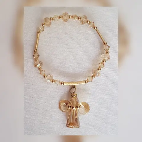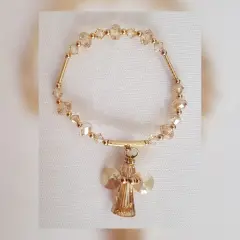 Pulsera autoajustable para NIÑA en gold filled y cristal facetado color CHAMPAGNE, dije ángel en gold filled, cristal facetado y mini rondel de Pave c/circonias. Dimensiones cms: 4.5 circunferencia, dije 2.2 x 2.2***EL BRILLO DE LA PULSERA ES MUY LINDO Y NO LO CAPTA LA FOTOGRAFÍA***ES PARA NIÑA*****20 micras de oro 14 kilates adheridas a presión, calor y laser sobre metal (cobre o latón). El peso en oro de una pieza en gold filled, corresponde a 1/20o de su peso total, o sea, un 5% oro.**