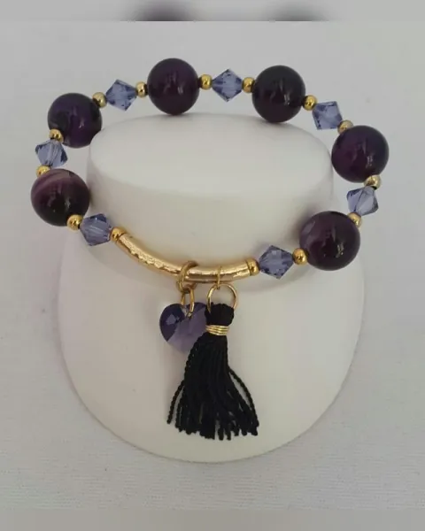 Pulsera autoajustable en oro laminado color DORADO, dije corazón cristal checo y bisutería fina en tono PURPURA MARMOLEADO. Dimensiones cms: 6 diamétro.***QUEDA A UNA MUÑECA DELGADA***20 micras de oro 14 kilates adheridas a presión, calor y laser sobre metal (cobre o latón). El peso en oro de una pieza en oro laminado, corresponde a 1/20o de su peso total, o sea, un 5% oro.***EL BRILLO DE LA BISUTERÍA ES MUY BELLO Y LA FOTOGRAFÍA NO LO CAPTA. LA EXCELENTE CALIDAD DE LA MISMA, PERMITE QUE NO SE OPAQUE CON EL USO***