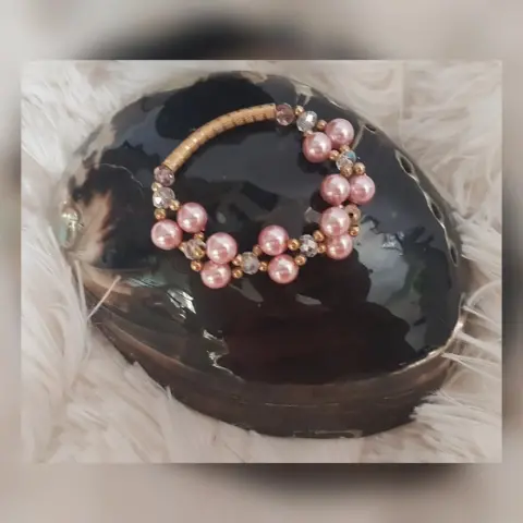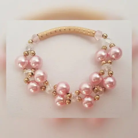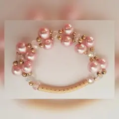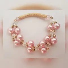 Pulsera Autoajustable c/tubo y esferas en oro laminado, perlas sintéticas tono ROSA BEBÉ y cristal facetado translúcido. Dimensiones cms: 5 diámetro.***EL BRILLO DE LA PULSERA ES MUY BELLO Y NO LO CAPTA LA FOTOGRAFÍA***QUEDA A UNA MUÑECA*** DELGADA***