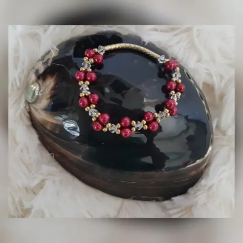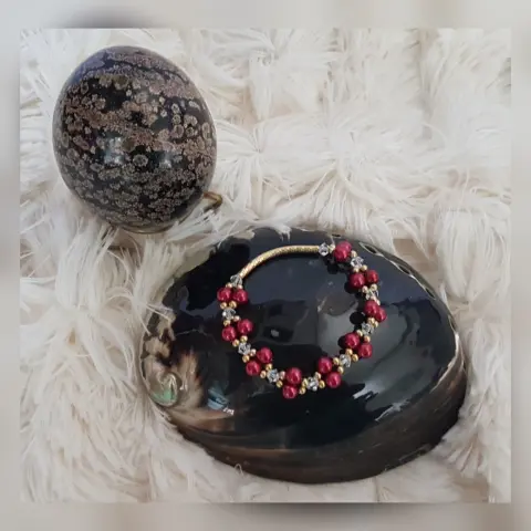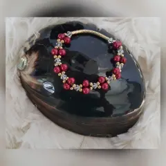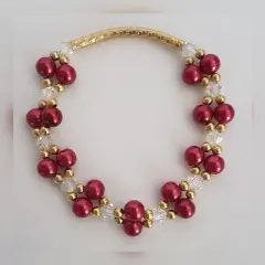 Pulsera Autoajustable c/tubo y esferas en oro laminado, perlas sintéticas tono VINO TINTO y cristal facetado translúcido. Dimensiones cms: 5 diámetro.***EL BRILLO DE LA PULSERA ES MUY BELLO Y NO LO CAPTA LA FOTOGRAFÍA***QUEDA A UNA MUÑECA DELGADA***