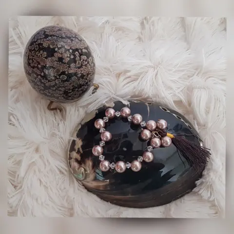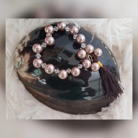 Pulsera Perla Sintética Copete. Pulsera autoajustable en perla sintética color CAOBA, cristal facetado translúcido y copete. Dimensiones cms: 5.5 circunferencia.***QUEDA A UNA MUÑECA DELGADA***