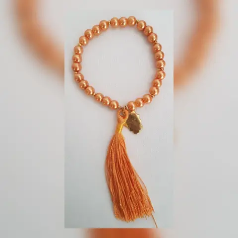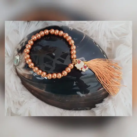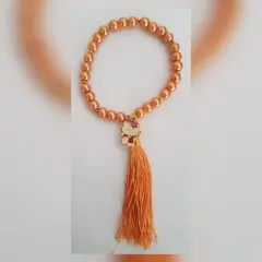Pulsera autoajustable en perla sintética color COBRE, bolitas tono bronce, c/dije Hello Kitty y copete. Dimensiones cms: 7 circunferencia.