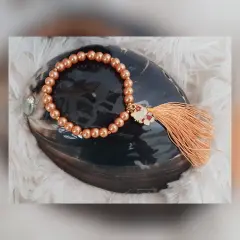 Pulsera Perla Sintética HK Cobre. Pulsera autoajustable en perla sintética color COBRE, bolitas tono bronce, c/dije Hello Kitty y copete. Dimensiones cms: 7 circunferencia.