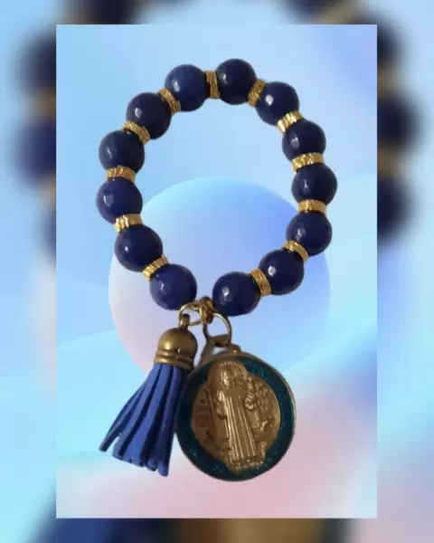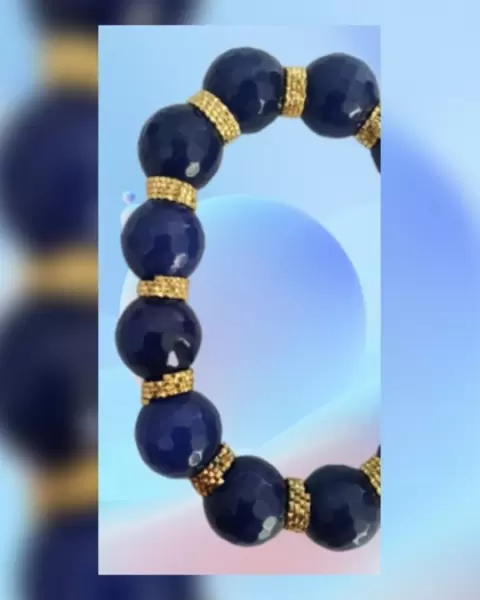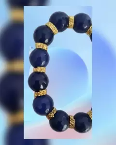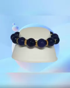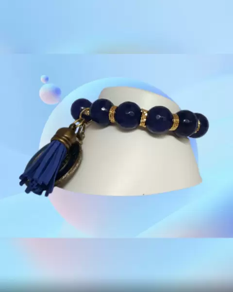 Pulsera autoajustable en piedras naturales de alta calidad tono AZUL IMPERIAL, anillos oro laminado, medallón SB y pompón. Dimensiones cms: 7.5 circunferencia (sin estirar)***LA CALIDAD DE LAS PIEDRAS Y LA ORFEBRERÍA DE LOS ANILLOS ES MUY BELLA Y NO LOS CAPTA LA FOTOGRAFÍA***