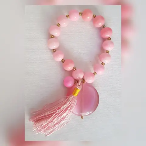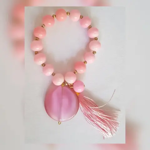 Pulsera autoajustable esferas acrílico en tono ROSA BEBÉ, dije piedra natural redonda, esferas en oro laminado y copete. Dimensiones cms: 5 diámetro, dije 3 diámetro.***QUEDA A UNA MUÑECA DELGADA******LA PULSERA SE ENTREGA SIN CAJA, ESTA SOLO ES UN ELEMENTO DECORATIVO***