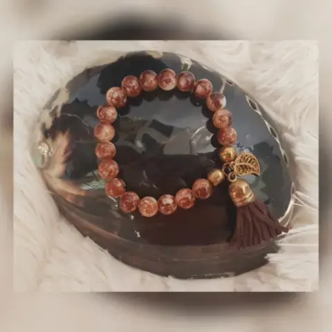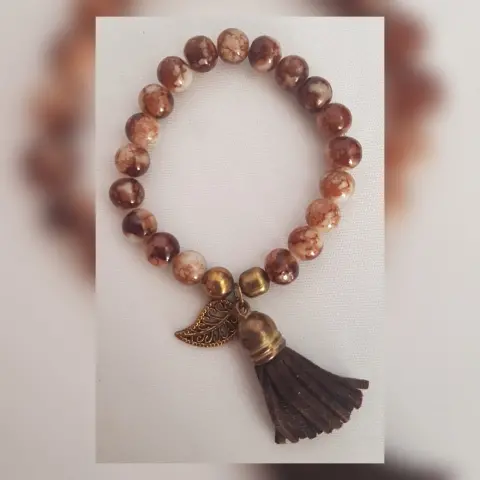 Pulsera autoajustable esferas acrílico en color TABACO efecto marmoleado, dije hoja tono DORADO y copete. Dimensiones cms: 6 diámetro, dije 1.5 × 1 diámetro.***QUEDA A UNA MUÑECA DELGADA***