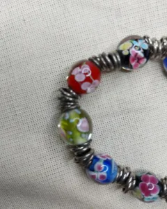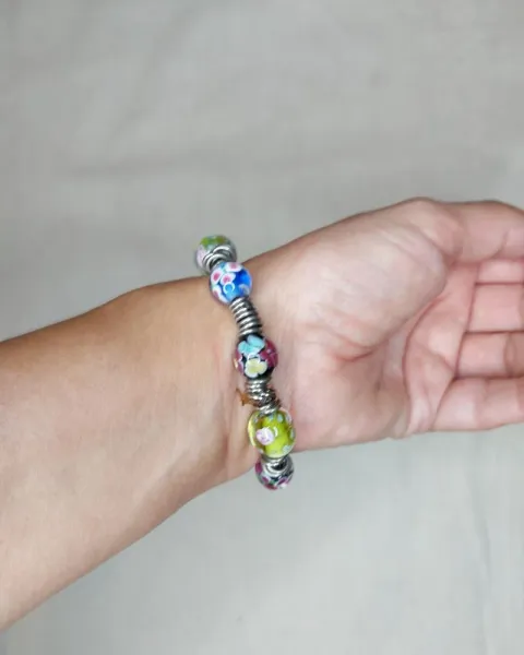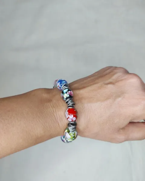 Hermosa pulsera tipo murano con argollas plateadas entre una y otra, excelente regalo, tiene muchos colores y florerías en cada una de las bolsas de cristal
