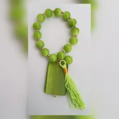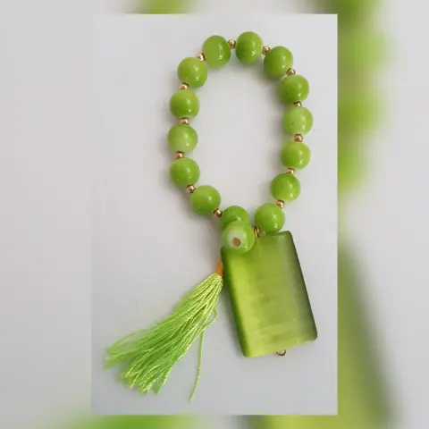 Pulsera Verde Dije Piedra Rectangular. Pulsera autoajustable esferas acrílico en tono VERDE MANZANA, dije piedra natural rectangular y copete. Dimensiones cms: 6 diámetro, dije 3.5 × 2.5 diámetro.***QUEDA A UNA MUÑECA DELGADA***