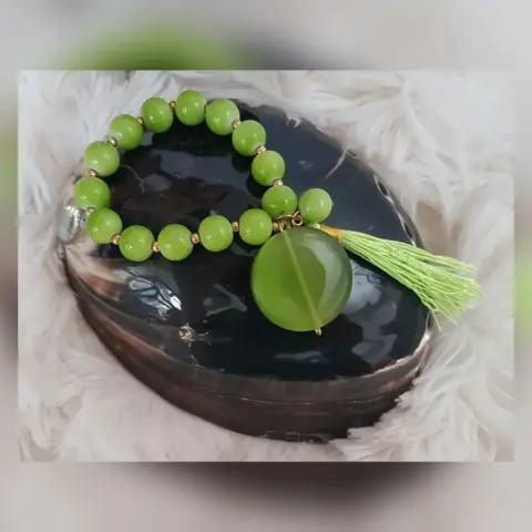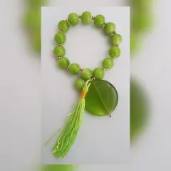 Pulsera autoajustable esferas acrílico en tono VERDE MANZANA, dije piedra natural redonda y copete. Dimensiones cms: 6 diámetro, dije 3 diámetro.***QUEDA A UNA MUÑECA DELGADA***