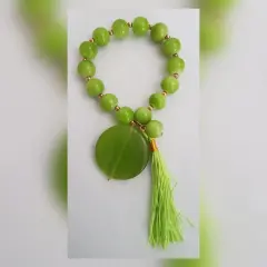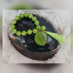 Pulsera Verde Dije Piedra Redonda. Pulsera autoajustable esferas acrílico en tono VERDE MANZANA, dije piedra natural redonda y copete. Dimensiones cms: 6 diámetro, dije 3 diámetro.***QUEDA A UNA MUÑECA DELGADA***