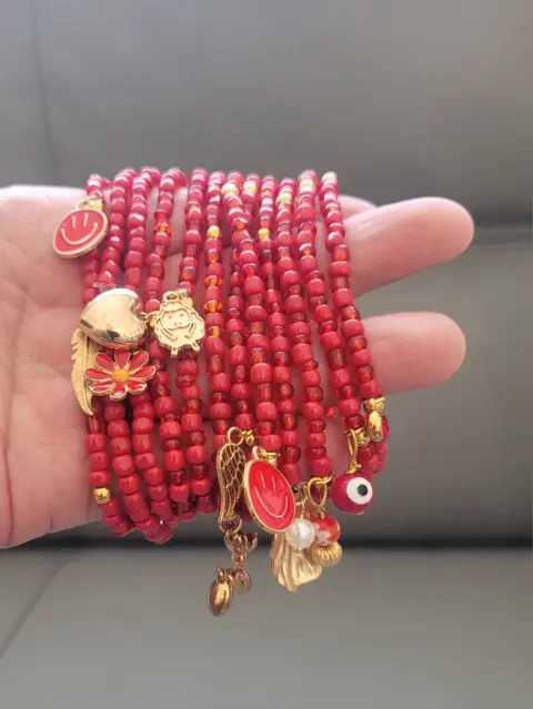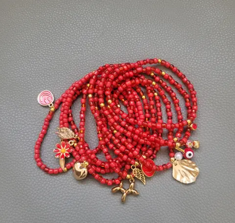 Pulseras rojas. Hermoso juego de 12 pulseras en chaquira de color rojo, con cuentas y separadores en color dorado de acero inoxidable y hermosos dijes de diferentes formas esmaltados y en acero inoxidable