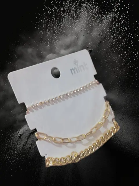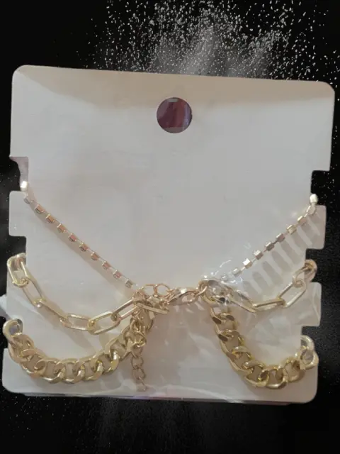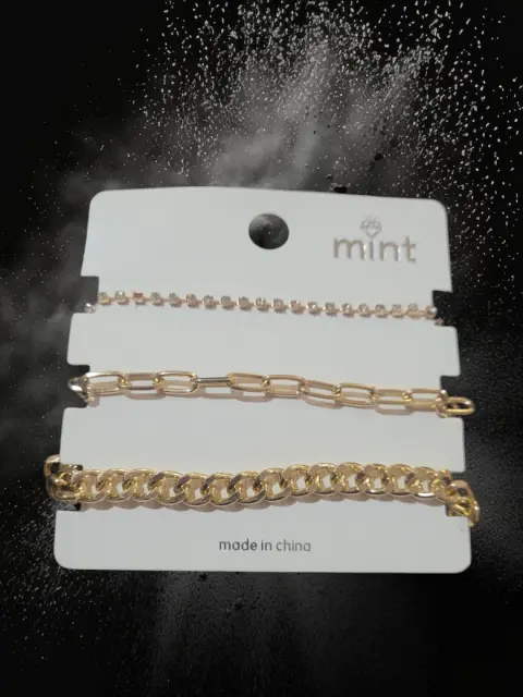 Set de 3-Piezas de Esclavas Mint de fantasia, varios tamaños en color dorado, 1. Trensada, 1. Con eslabones y 1. Con piedras brillantes, hechas de acero inoxidable, nuevas a estrenar con etiqueta en buen estado cosmetico.