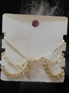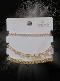 Set de 3-Piezas de Esclavas Mint. Set de 3-Piezas de Esclavas Mint de fantasia, varios tamaños en color dorado, 1. Trensada, 1. Con eslabones y 1. Con piedras brillantes, hechas de acero inoxidable, nuevas a estrenar con etiqueta en buen estado cosmetico.