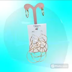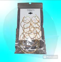 Set de 5-Pares de Arracadas Bloom de fantasia en color Dorado, estilo liso con varios tamaños y cierre de precion, elegante diseño para cualquier atuendo, nuevas a estrenar con etiqueta.