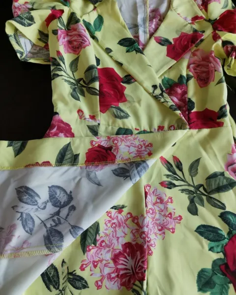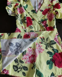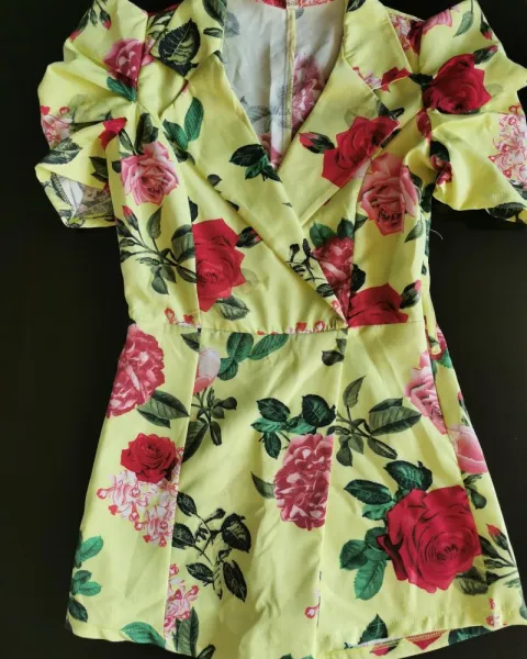 Jumper Amarillo Con Estampado De Flores. Jumper de short falda con cierre en el costado, la tela es estampado de flores incluye cinturón de la misma tela
