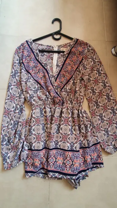 Hermoso jumper super bonito tela delgada forro en parte short escote en V con botón opcional discreto, manga larga tela diseño en color crema , con resorte pequeño en la cintura . Talla S queda perfecto M marca a i mor .