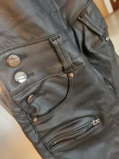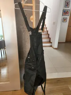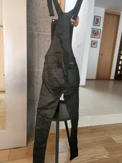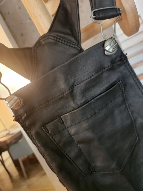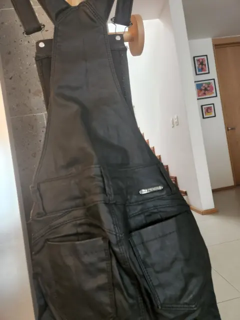 Overol color negro tipo vinipiel. El diseño se amolda al cuerpo (es muy pegado) y entubado. Tiene un bolsillo en la parte frontal del overol y simulación de bolsillos tanto del lado derecho como izquierdo en la parte de enfrente. En la parte trasera sí tiene 2 bolsillos y se abotona/abrocha por medio de tres botones que se en cuentran del lado lateral, derecho. Es un diseño súper lindo y moderno.Talla 7