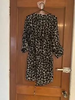 Es muy bonito y se uso poco es blanco con negro, marca talla 6 es M