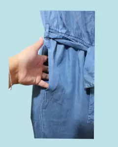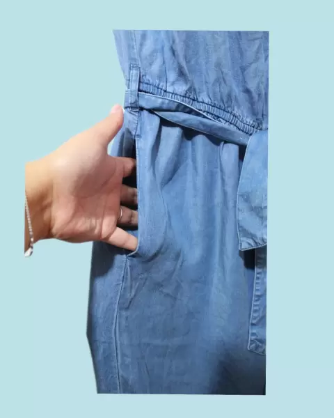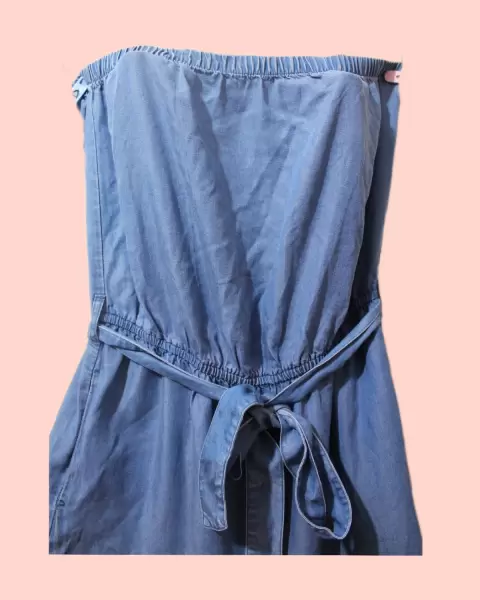 Jumpsuit sin tirantes. Super fresco y ligero. Tiene pierna ancha. Elástico en el contorno del pecho para evitar que se baje. Super cómodo, la tele es ligera tipo mezclilla delgada.