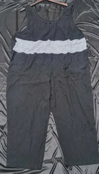 JUMPSUIT TALLA 2XL. JUMPSUIT DE USO, TALLA 2XL, COLOR NEGRO, CON DETALLES AZUL MARINO Y BLANCO,ENTREPIERNA EN PERFECTO ESTADO ÚLTIMA FOTO , DE HOMBRO A HOMBRO 46.5 CM, DE AXILA A AXILA 65 CM, CINTURA 128 CM, CADRTA 130 CM, TRSE BOLSILLOS FUNCIONALES,CORTE RECTO