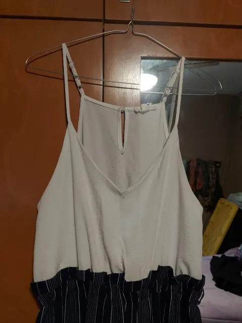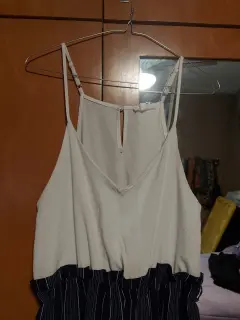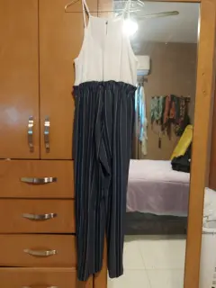 Jumpsuit color blanco y en la parte de abajo azul con franjas blancas talla grande tiene detalle en la parte de arriba en el cuello V se descoció un poco pero te lo arreglo rápido. Lo demás esta en buena condición.