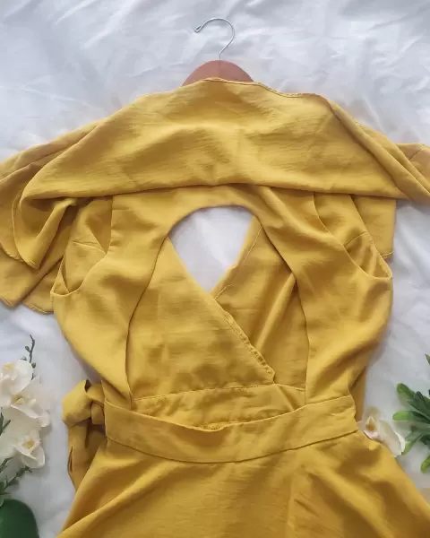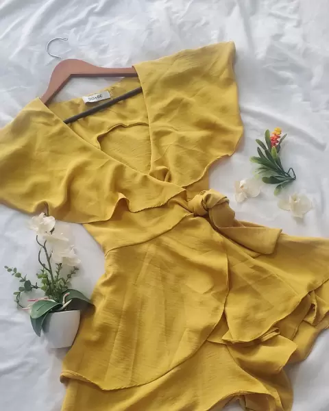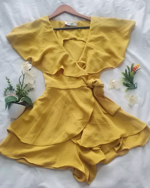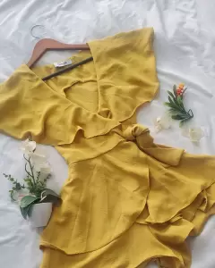 Jumpuit falda short. Cadual . Color mostaza. Cruzado, listón para ajustar y adornar a la cintura, tela muy suelta con caída, escote y capa en la espalda,un solo uso en perfecto estado.