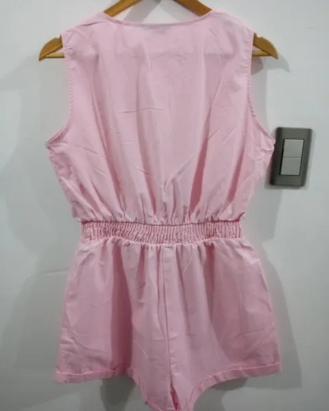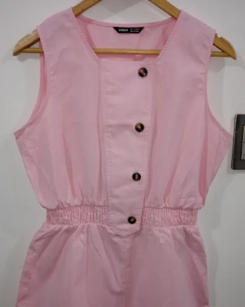 Mono rosa Shein. Mono color rosa chicle con elástico que acentúa la cintura, sin mangas, escote cuadrado y botones frontales (trae uno de repuesto).