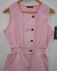 Mono color rosa chicle con elástico que acentúa la cintura, sin mangas, escote cuadrado y botones frontales (trae uno de repuesto).