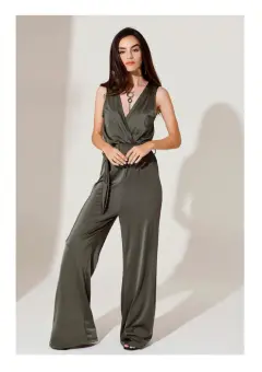 Hermoso y elegante palazzo satinado, tiene escote pronunciado, es verde militar, la tela es satinada. Luce bello con tacones para un evento formal o en jardín. Todo depende de los accesorios 😉