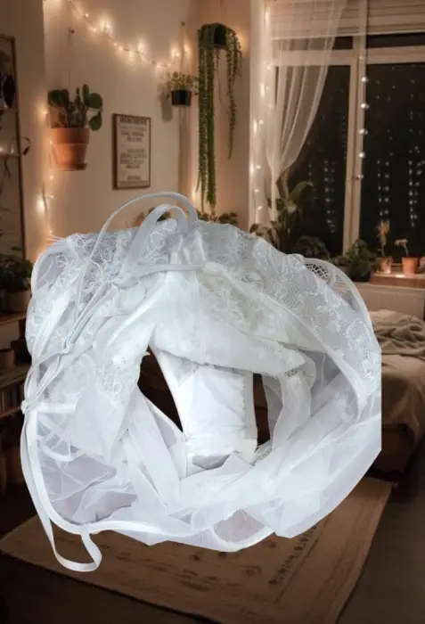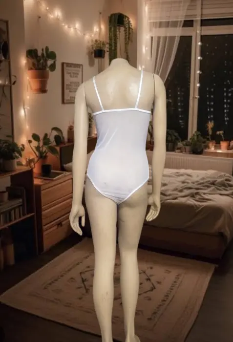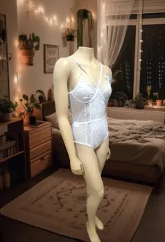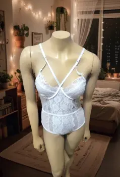 Baby Doll de Encaje Caryter, talla mediana, color blanco, con cierre de broches de precion en la entrepierna, tela transparente con delivados acentos de encaje y doble tirante ajustable y lineal en pecho, hecho de algodón y poliéster, mide 36cm de axila a axila, 34cm de cintura 36cm de cadera 18cm de tirante ajustable con 71cm del hombro hacia abajo nuevo a estrenar con etiqueta en buen estado.