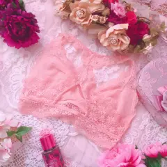 ♥️BELLO BRALETTE ENCAJE ROSA SIZE M♥️. Lindo y bello bralette de encaje color rosa melón, con tirantes gruesos y cross, pequeño balconette, sin detalles ni roturas a excepción de falta de etiqueta textil. Por favor checar bien las fotos para evitar devolución o calificación no concordante a mi descripción. Envíos los lunes ❤️