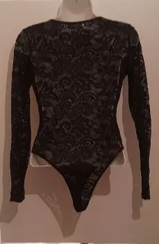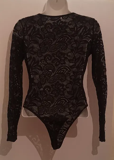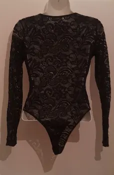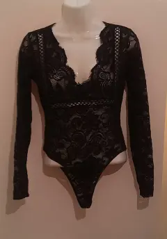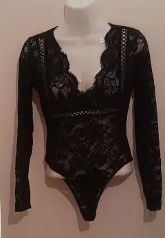 Bonito body negro, semitransparente, talla S-M, en buen estado, solo tiene algunos detalles derivados del uso ( algunos hilos un poco jalados), pero en general tiene buena vida útil aún