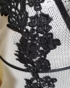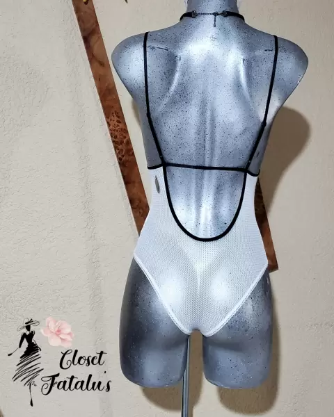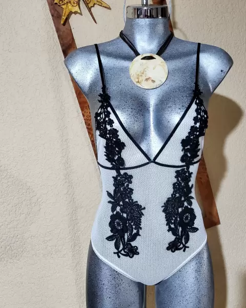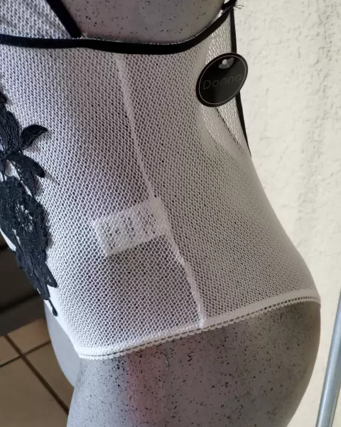 Body Sexy con ajuste en tirantes y botones de presion plastificados y forrados en parte intima.Color: Blanco con aplicaciones de encaje en color negro.Talla: MTela: 100% polyester en MayaDetalles: ningúno