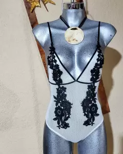 Body Romantic. Body Sexy con ajuste en tirantes y botones de presion plastificados y forrados en parte intima.Color: Blanco con aplicaciones de encaje en color negro.Talla: MTela: 100% polyester en MayaDetalles: ningúno