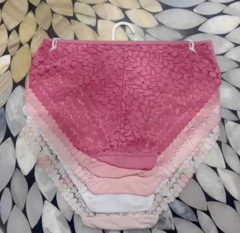 Set de 5 bonitos panties bikini, colores en rosa y blanco. Suaves y con encaje en la parte de atrás.Talla M👉90% Nylon👉10% Spandex
