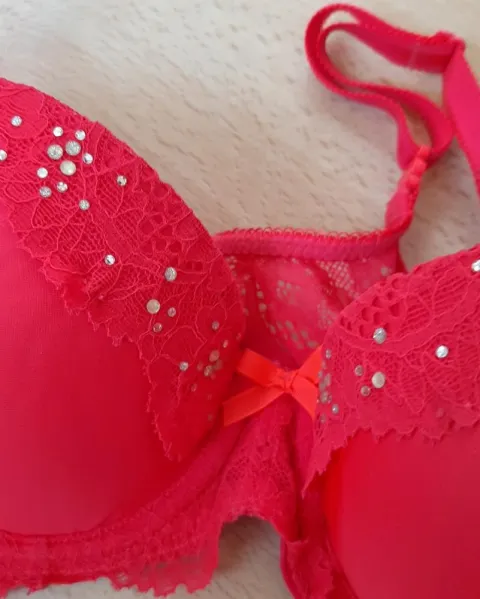 Brassiere rojo intenso de Victoria Secret, talla 34B, con destellos brillantes, push UP. Te encantará!