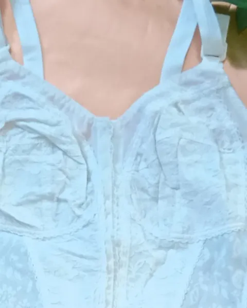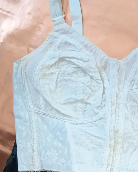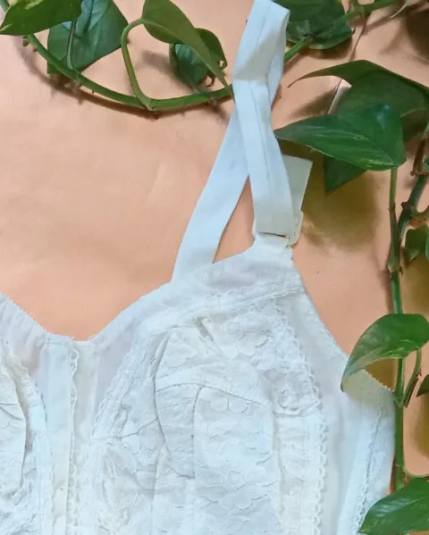 Joya de bustier blanco, con bonitos detalles de flores, se abrocha por enfrente.Para copa 34 B/C