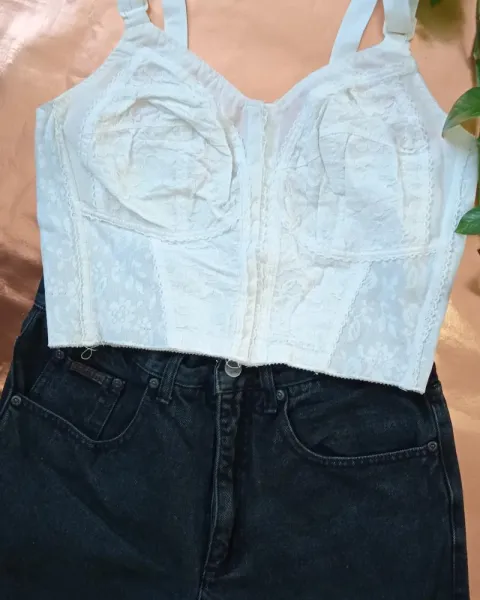 Bustier blanco. Joya de bustier blanco, con bonitos detalles de flores, se abrocha por enfrente.Para copa 34 B/C